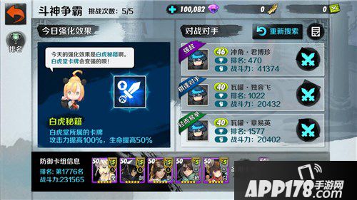 斗神争霸是一个50级开启的20V20的大型比武战(5张上阵卡牌+15张备用卡组)。斗神争霸有一个独立的排名系统,玩家将根据自己当前的排名挑战不同的对手。