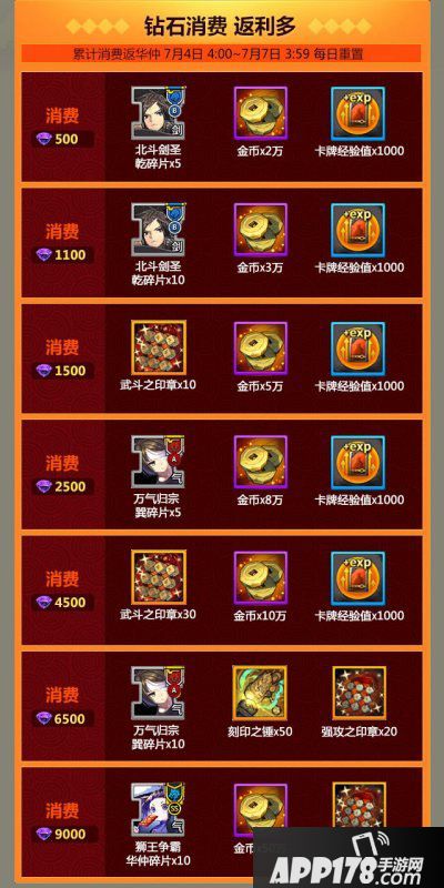 7月4日~7月6日,每日消耗一定的钻石,即可获得SS狮王争霸华仲碎片*10+50W金币+强攻之印章*30的消耗好礼!还有武斗之印章、刻印之锤、海量金币等消费返礼等着你!不要错过哟!