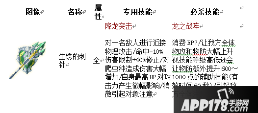 生锈的刺针辅助用替换武器 必杀技能『龙之战阵』可以增加团队的物防与物攻,取舍上可以与喜悦大剑、咒红黑剑做交替,两把武器在施展技能时都会强烈吸引注意,必须要多加注意。