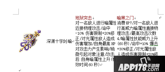深渊十字剑 这把为主要的输出武器,也是符合多连段、消耗少、伤害高、回复多的技能型态,并且在使用第一把技能过后暗属性技能威力上升持续60秒,而十字剑的冷却则是25秒等于可以常驻增伤BUFF。