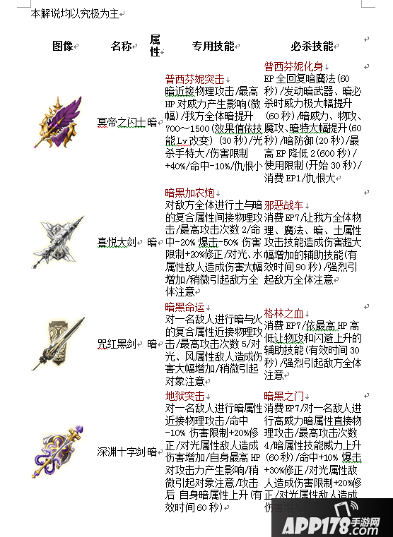 喜悦大剑 打群体战中可以透过他的范围攻击来回复EP,必杀技能给予玩家物理、魔法、暗、土属性攻击技能造成伤害超大幅增加非常的实用,不管是自己还是队友包含魔法系列也会受益,是一把CP值很高的辅助武器。