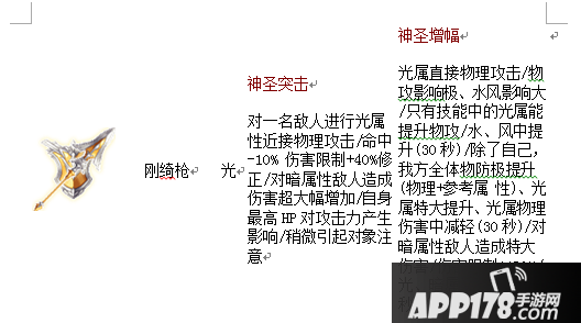 刚绮枪是一把可以输出也可以给队友BUFF的武器,必杀技能『影子增幅』除了自己,全体物防极提升同时也上升自己的暗属性,EP消耗少、伤害数字也相当不错尤其是打克属的光属性。