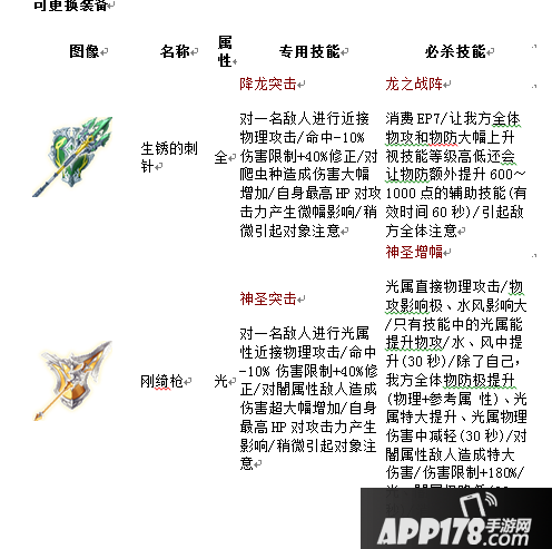 生锈的刺针 辅助用替换武器 必杀技能『龙之战阵』可以增加团队的物防与物攻,取舍上可以与治愈之细剑做交替 ,两把武器在施展技能时都会强烈吸引注意,必须要多加注意。