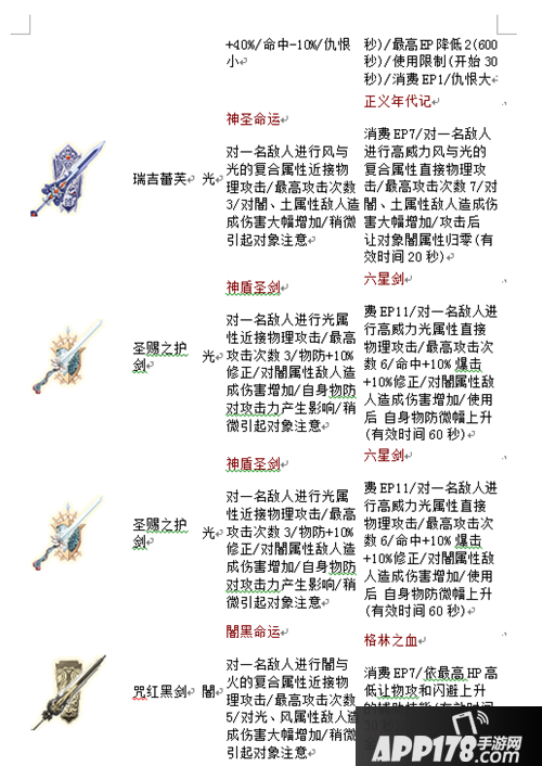 咒红黑剑 是除了光女神以外第二个增伤武器,必杀技能『格林之血』依最高HP高低让物攻和闪避上升的辅助技能,同时给予进攻与防御提升!! 玩家可以先使用光女神化身将血量上限提高在使用此技能风味更佳。