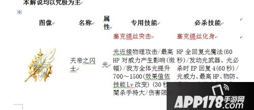 刚绮枪 是一把可以输出也可以给队友BUFF的武器,必杀技能『神圣增幅』除了自己,全体物防极提升同时也上升自己的光属性,EP消耗少、伤害数字也相当不错尤其是打克属的闇属性。