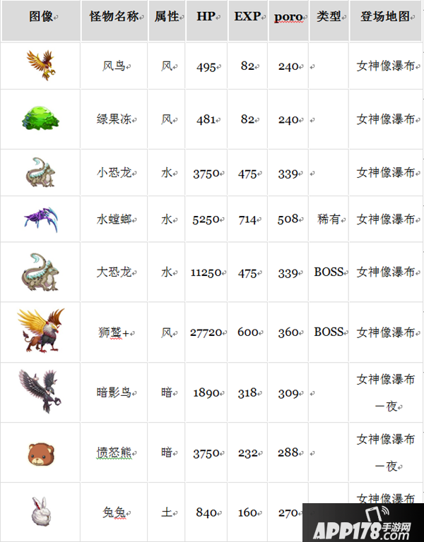 白天的女神像瀑布,分别有5级以及15级等,二种适合层级的怪物在地图上登场。5级以风鸟以及绿果冻为主,15级则是水属性的大小恐龙。整体攻略难度比千年树-夜高一些,虽然经验值稍微多一点,不过CP值不如千年树-夜。