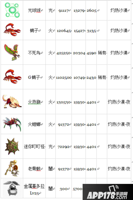 不过跟前一张地图一样,灼热地狱登场的稀有怪基本上也分成二种版本。只有在打蝎子的时候才有机率跑出G蝎子。攻略其他怪物时,刷出的稀有怪原则上以不死鸟为主。
