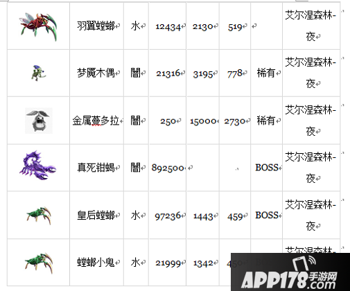 夜晚的艾尔涅森林严格讲起来同样是螳螂的主场,螳螂以及羽翼螳螂的数量颇多。虽然羽翼螳螂的HP稍微多了一些,不过经验值的部分还不错。