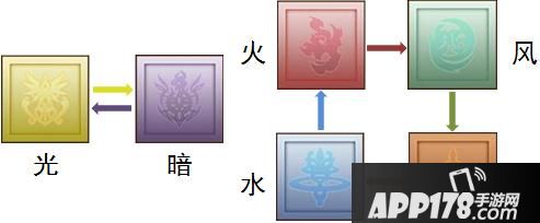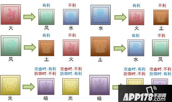 1. 游戏有6大属性,光、暗、火、风、土、水,其中光暗相互克制,火风土水依次克制。