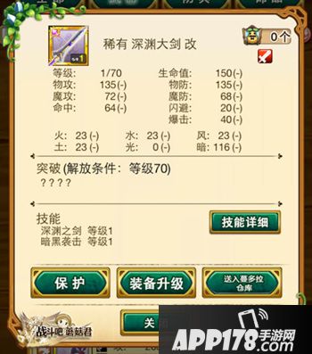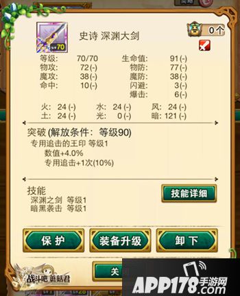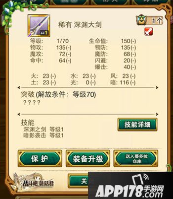 1. 稀有装又称金装,与稀有改(金改)、史诗类同名武器的专用技能一致,用于史诗类同名装备升级时,有概率提升专用技能等级。面板属性略低于史诗武器,必杀技能略低于史诗武器效果、以深渊之剑为例: