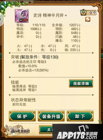PS:精神系列武器很多同名的,上图所示的为暗属性的精神半月斧,与光属性的并不同,同样的,再其他装备或者饰品的进阶上,很多同名的装备,但是由于技能不一样而无法进行合成,这一点萌新一定要注意,多多留心,以示区分。