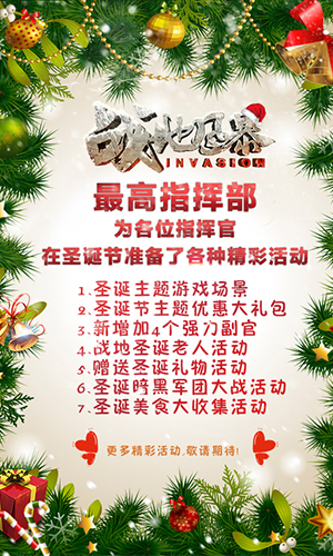 圣诞节期间,还有一大波活动在游戏中等着大家,好礼源源不断!圣诞节主题超值大礼包、圣诞礼物大赠送、圣诞美食大收集、圣诞黑暗军团大作战等等!浓浓的圣诞节日气氛洋溢在游戏中,欢乐温馨地陪伴大家过完这个圣诞!还有更多活动,敬请到游戏中查看~