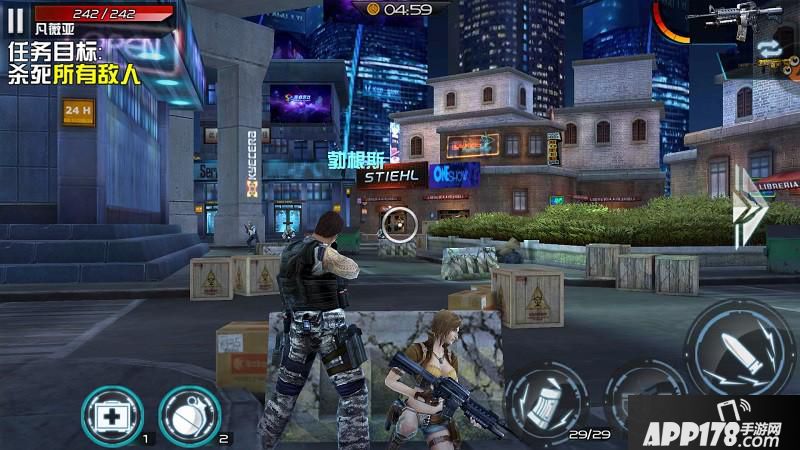 操作:掩体FPS战斗,左手瞄准,右手射击,可更换武器。
