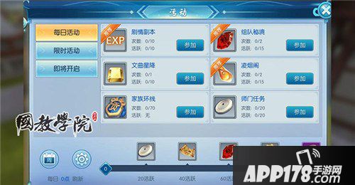 建议小伙伴们先进行师门任务和文曲星降,师门任务操作简单,是新手升级的利器。师门一轮十个总计两轮的任务可以给小伙伴们带来丰富又安全的收益,全过程都可以挂机自动完成,在完成师门任务之后会得到二十点活跃点数和两万银币的奖品。如果小伙伴感觉挂机刷怪做任务开始无聊了,就可以点开文曲星进行答题。无论成功还是失败都有丰富的奖品,答题错误,获取的经验和银币会相应减少,如果不满足5题答对,将无法领取礼包。完成文曲星降之后可以获得十个活跃值