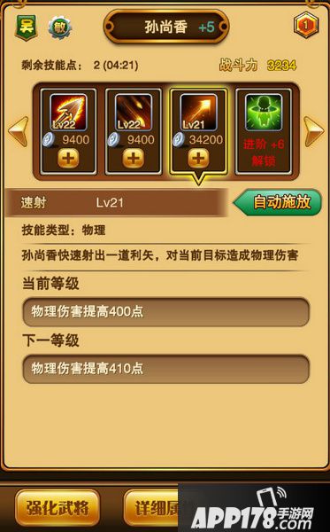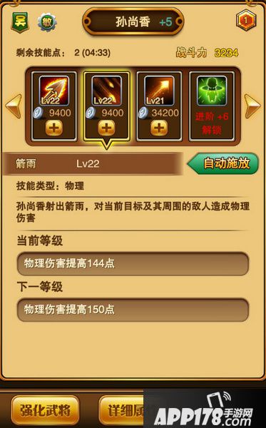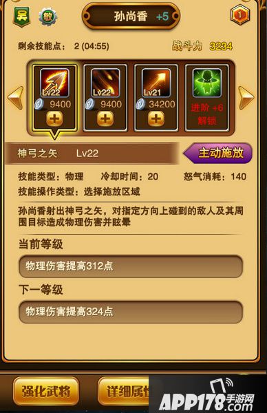 神弓之矢:孙尚香的主动技,纯物理攻击,20秒冷却时间,怒气消耗140。