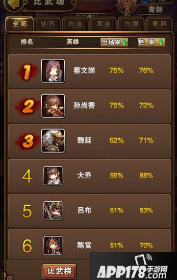 比武场中的神将榜可以查看所有主公的武将中出场率最高的武将。
