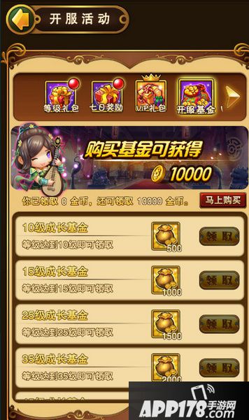 在活动功能下,打开开服基金面板,花费少量金币购买后,每达到一定等级,均可领取海量金币,最多可获得10000金币哦。