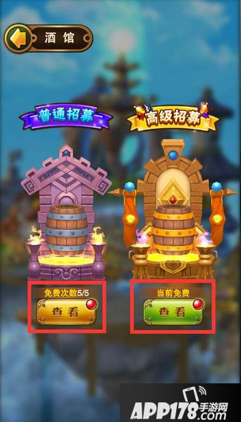 酒馆是招募武将的场所,可以使用2种招募方式,普通招募和高级招募,普通招募每天有5次免费机会,有几率获取武将魂石(可用于合成完整武将),高级招募每46小时刷新一次免费机会,也可以使用高级招募令或金币进行高级招募,有几率直接获取三星武将。
