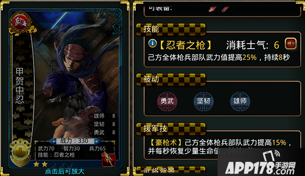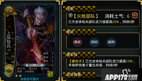 那么来看下这两张卡牌所具备的技能吧,这两张卡除了国家之外技能其实是相同的,他们的身上都具备着六点的士气消耗值,以及具备了能够使提升全部枪兵战队百分之二十四武力值、百分之五十的移动速度以及效果在一般情况下能够维持八秒。