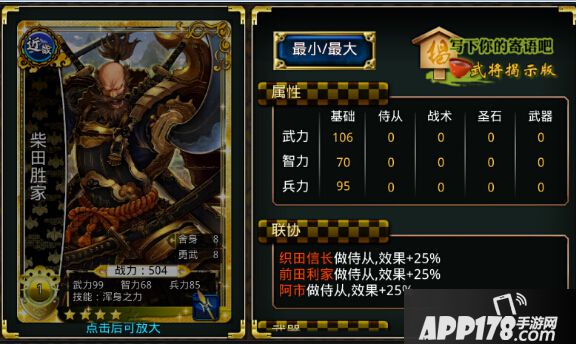 柴田胜家基础属性拥有极高的武力和兵力,可谓是可抗可打的前排英雄。