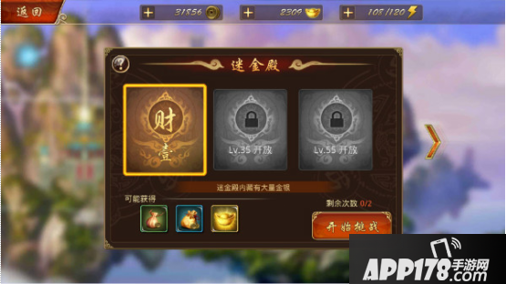 前面说到消费,那么这里就谈谈铜钱的获得吧。游戏内的铜钱除了通过通关“副本”获得,以及“熔炼”装备时可以获得以外,还可以通过“修悟崖”里的“迷金殿”获得大量金钱,“迷金殿”在完成规定任务章节前并不会开启,笔者印象里规定任务章节应该是在第二章节里中间的某一关卡吧。
