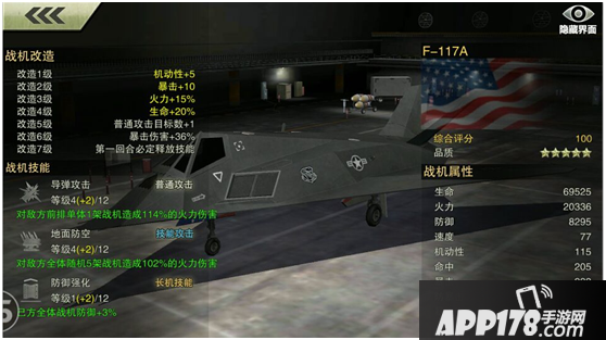 第一个F117A,开服充值活动送,出碎片的战役比较多,后期的活动里也经常有117A,容易高改。大家别看它是100的评分,我现在已经是改4,马上改5了,普攻目标+1,等于多一架战机,而且伤害很恐怖。