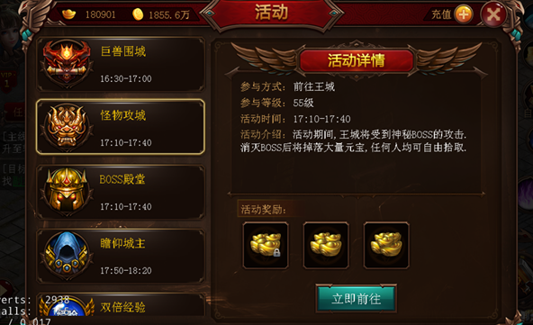 怪物攻城这个活动必须参加,因为这个活动每天三次,而且每次送的元宝都超级多啊,所以这个活动能够获得的元宝是最多的,没有之一!!!