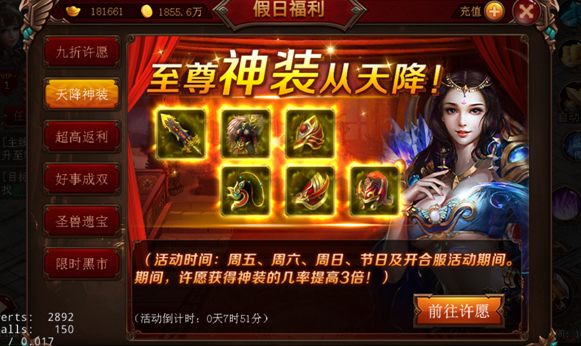 如果错过了开服,那就不要错过节日,比如周末啦,国家法定节日啦,都会有各种活动的,这个时候充值不仅有额外赠送,还可以许神装,平时许愿时没有神装的哦!