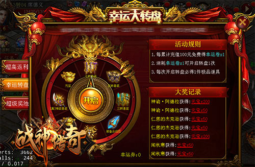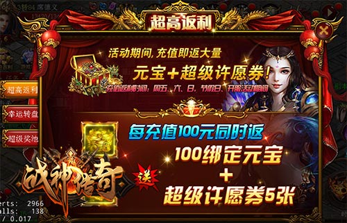 幸运转盘是我们最熟悉的玩法之一了,然而作为《战神传奇》情人的你们,元宵与情人节自然要为你们全面升级奖励!每充100元即可换取幸运券一张开启转盘,每次旋转必得一件极品道具,转生限量套装、数不清的元宝、稀有装备合成石转转就到手!15日之前充值100元不仅能转幸运转盘,还可参加超级抽奖,所有玩家充值的元宝都将抽取10%放入我们的超级奖池中,抽奖必得50-100元宝,据说幸运玩家还可以获得奖池内全部奖金哦!