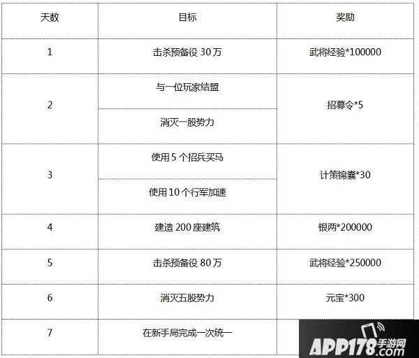 活动内容:新手玩家只要完成指定任务,即可获得元宝、招募令、功勋宝箱等大量奖励,助您快速攻城统一!
