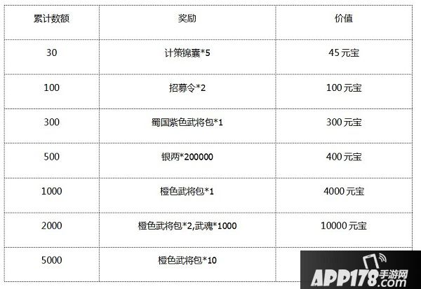 活动内容:累计充值一定金额,赠送大量的稀有橙将、银两、武魂等超值奖励!