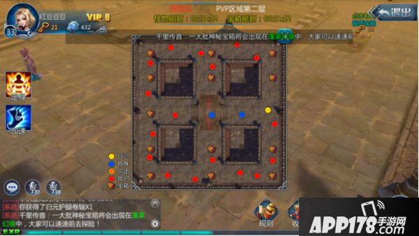 2、每日21:00-21:30期间:所有场景每隔1分钟刷新一次怪物,每隔2分钟刷新一次宝箱(打怪模式区域不刷新宝箱)。同时对战模式区域会刷新一个两仪珠,并且每层对战模式区会点名一位玩家。被点名的玩家在战斗中获得和失去的钥匙将翻倍。