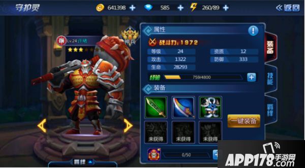 点击你需要进阶装备的守护灵,就会出现装备进阶界面啦,拥有的装备都可以一键装备的,如果未获得装备,玩家可以通过打主线副本或扫荡副本获得啦;