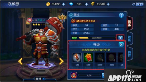 除了进阶装备可以提升守护灵的战斗力外,升级守护灵的技能也可以提高守护灵的伤害哦。随着守护灵的等级提升,玩家可以不断的升级技能。在升级技能前小编要透露一个玩家容易忽略的守护灵等级升级按钮,如下图标红的+号小按钮,点击后即可显示升级守护灵等级的界面啦,点击界面中经验药水可乐、薯条等等就可以升级守护等级啦(这个按钮好多玩家都没发现哟...嘿嘿嘿大家484要感谢我呢!)