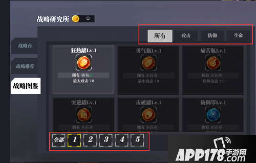 1、战略图鉴按照查看方式分为类型查看(所有、攻击、防御、生命)和等级查看两种方式,玩家通过点击战略的类型或者战略的等级,可以查看到该类型该等级下的所有战略及属性。