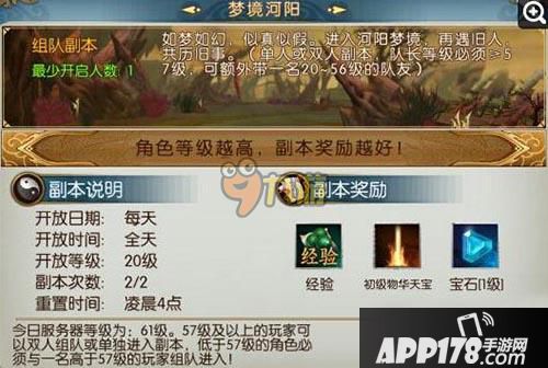 梦境河阳开启条件:90级以上老玩家组队,队员可带低级玩家,而且会有更高的收益
