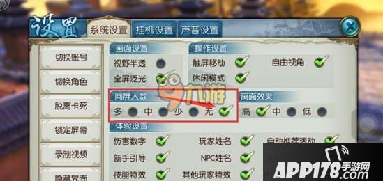 1、同屏人数一定要设置为【无】:玩家姓名,NPC姓名,技能特效,其他玩家特效,触屏移动也不能勾选!想想,当好不容易看到宠物刷出来你将如何从众多的人物阻挡,名字阻挡里面点到你心爱的“它”呢?