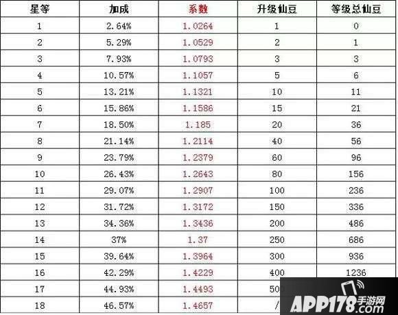 上面这个图是不同星等对应的百分数,以及不同星等升级需要的仙豆数。