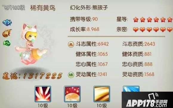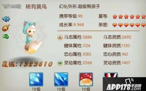 宠物界面包含以下重要属性——成长率、资质、星等、星等百分比、自身技能点数、额外技能点数、亲密度、面板属性。以下所有数据都是建立在常规宝宝基础上的(即黄鸟这个阶层的宝宝),我们不讨论低级宝宝(比如灵猴),也不讨论饕餮这种高级宝宝。