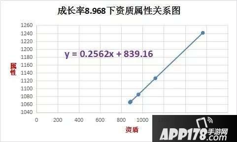 成长率为8.895时的资质属性关系公式为:y=0.2302x+747.49。