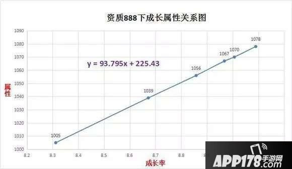 成长率为9时的资质属性关系公式为:y=0.2323x+754.46;