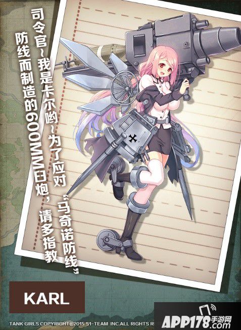 怪物级火炮,使用的是600mm的炮弹,被砸到非死即伤,如果说猎虎是吃货的话,这货就是个无底洞,弹药消耗量极大,虽然本人也会表现出不好意思,但依旧无法停下伸向弹药的手.即便威力超强,但卡尔的性格倒是意外的温和,属于不会吵架的类型(其实也没人敢跟她吵),很喜欢司令。