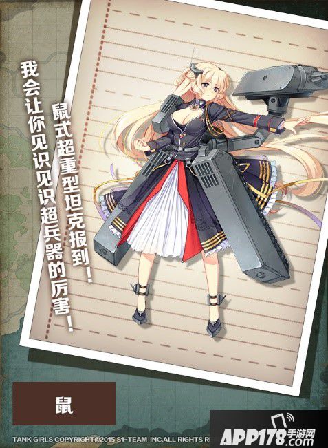 世界上最重的旋转炮塔式坦克,拥有独特的双炮系统,128mm主炮旁边有着一门75mm炮,“鼠”式是一个可靠的大姐姐形象,拥有一颗无限喜爱萝莉的心,只要能摸摸轻坦们的脑袋鼠式就会变得很开心,但对于敌人绝对不心慈手软,发起火来很可怕.