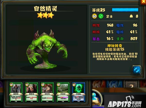 元素类怪的被动技能都是一样的遭到魔法伤害时获得偷取对手能量的buff。作为卫士系怪物,三星木元素满级生命值810,物抗41%,魔抗24%;四星木元素满级生命值1560,物抗50%,魔抗30%。整体来看算是一只中规中矩的肉盾,但比较惧怕魔法攻击。而从它的牌组来看,是战士系怪物的好搭档。