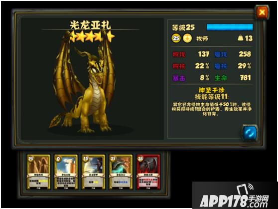 满级物攻102、魔攻258、物防22%、魔防36%、暴击8%、血量783;1层被动技能是当其他己方怪物低于30%血量时赋予其1个“护盾”、1个回合的“再生”效果并净化其附带的任何负面buff,满级11层是低于50%血量即可触发