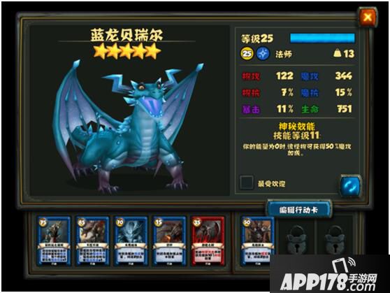 满级魔攻344、物防15%、魔防29%、暴击11%、血量753;1层的被动技能是每当能量为0时提升50%魔攻,满级11层时提升100%魔攻。
