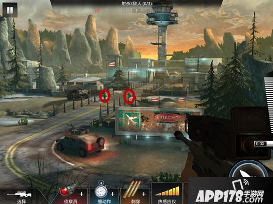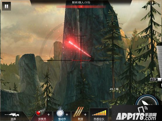 攻击完靠右侧的敌人后,大家可以看到屏幕上出现了狙击手的远程红外线,循着那个红外线找去,可以看到,在右上方的山上,有一个狙击手,瞄准他并迅速击毙。