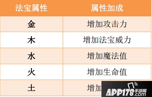 目前,法宝的属性分为5类:分别为金、木、水、火、土。