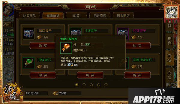 无暇升级宝石可以通过商城进行购买,也可以通过升级宝石升级来获得。每颗升级宝石(绿装)消耗1两金子可以升级为无暇升级宝石(紫装)。
