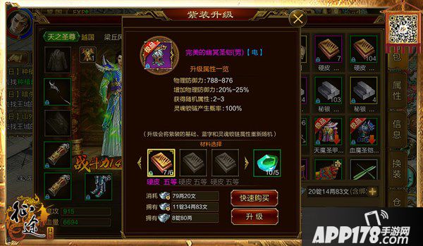 紫装升级需要消耗材料和祝福石和绑银,材料最低五等。紫装升级之后,基础属性、蓝字属性和灵魂锁链属性都会重置。如果想要获得极品属性,那么还需要进行改造。